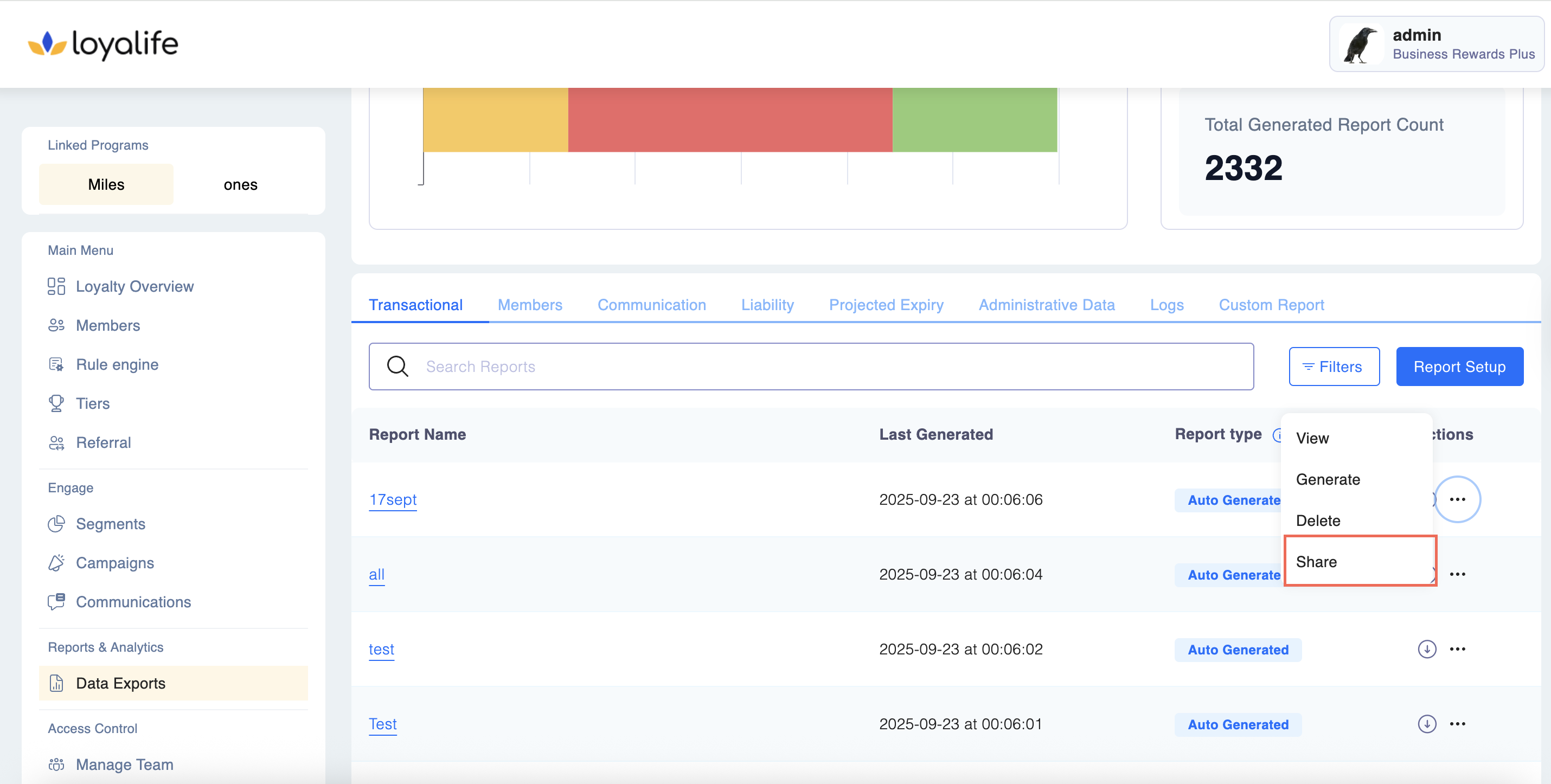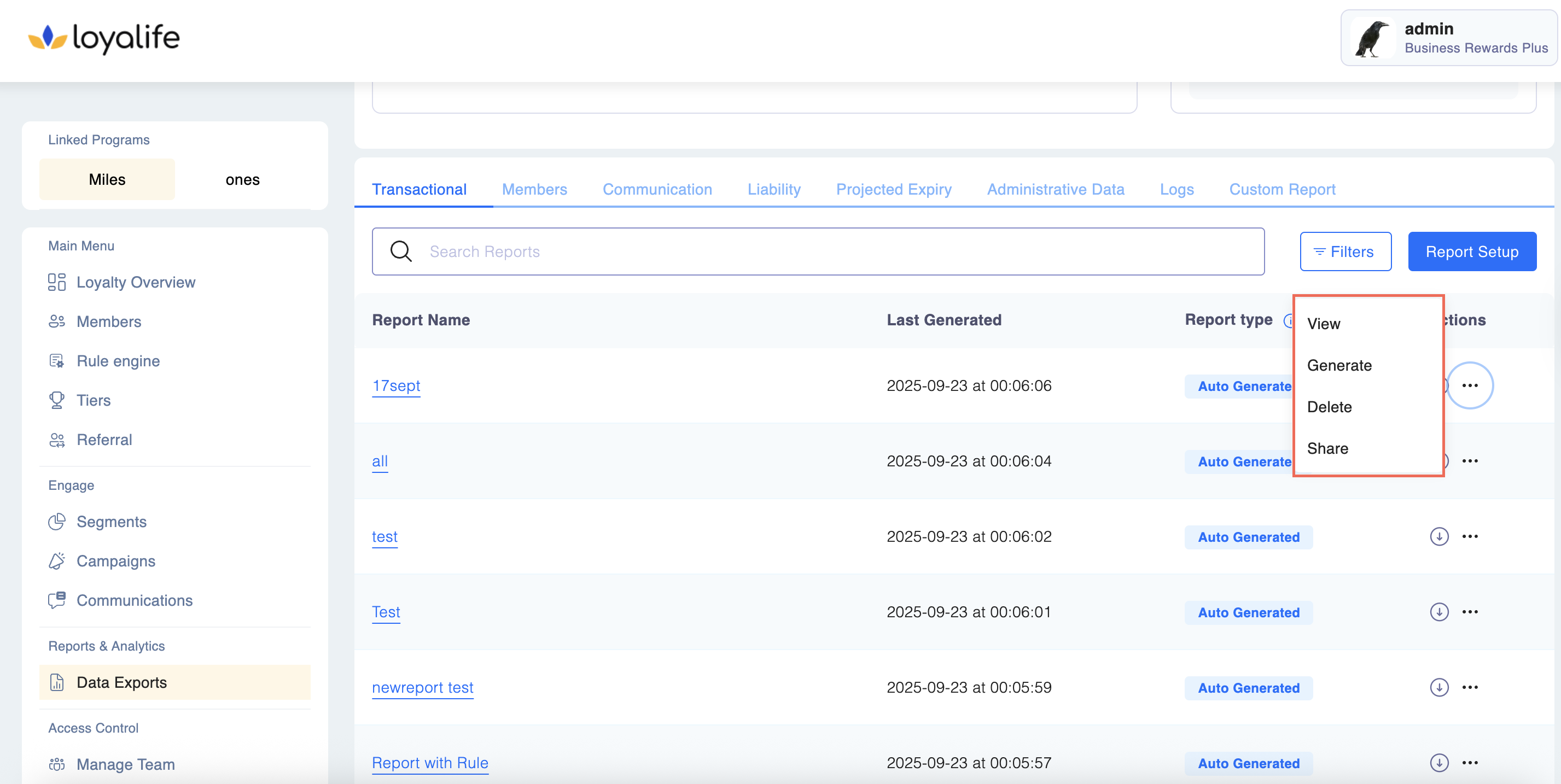 - Locate the view you want to access and click on the three dots at the right and then "Generate" and select the time period for which you want to generate the report.