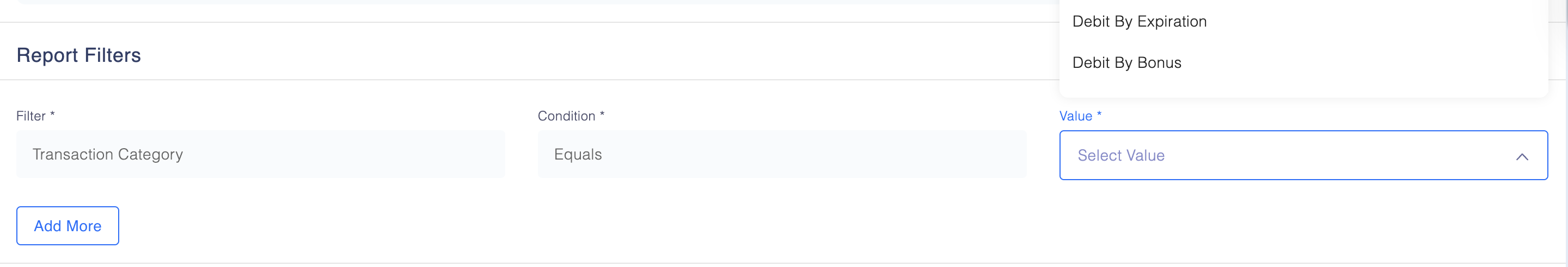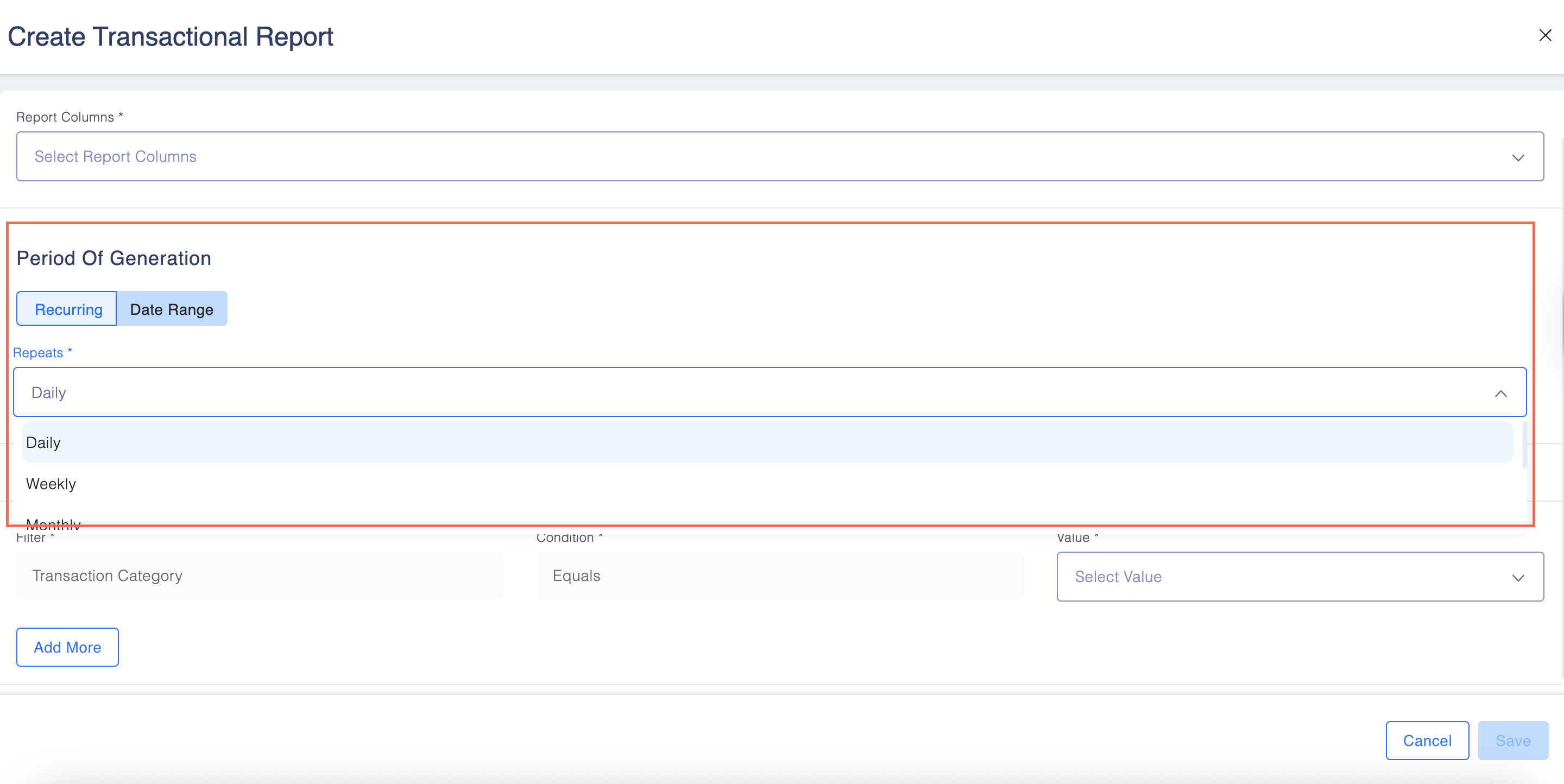 - **2.4 Report Filters: **Add the relevant filters by selecting the filter type, condition type and the value. You can choose to Add More filters to add the narration.