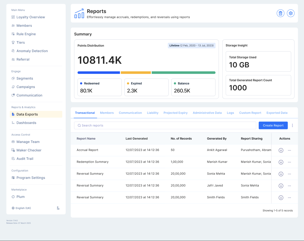 Transaction reports are designed to track all transactions related to loyalty programs, focusing on points accruals, redemptions, and other kinds of transactions. These reports are vital for monitoring transactional activities and the dynamics of loyalty points within a banking environment.