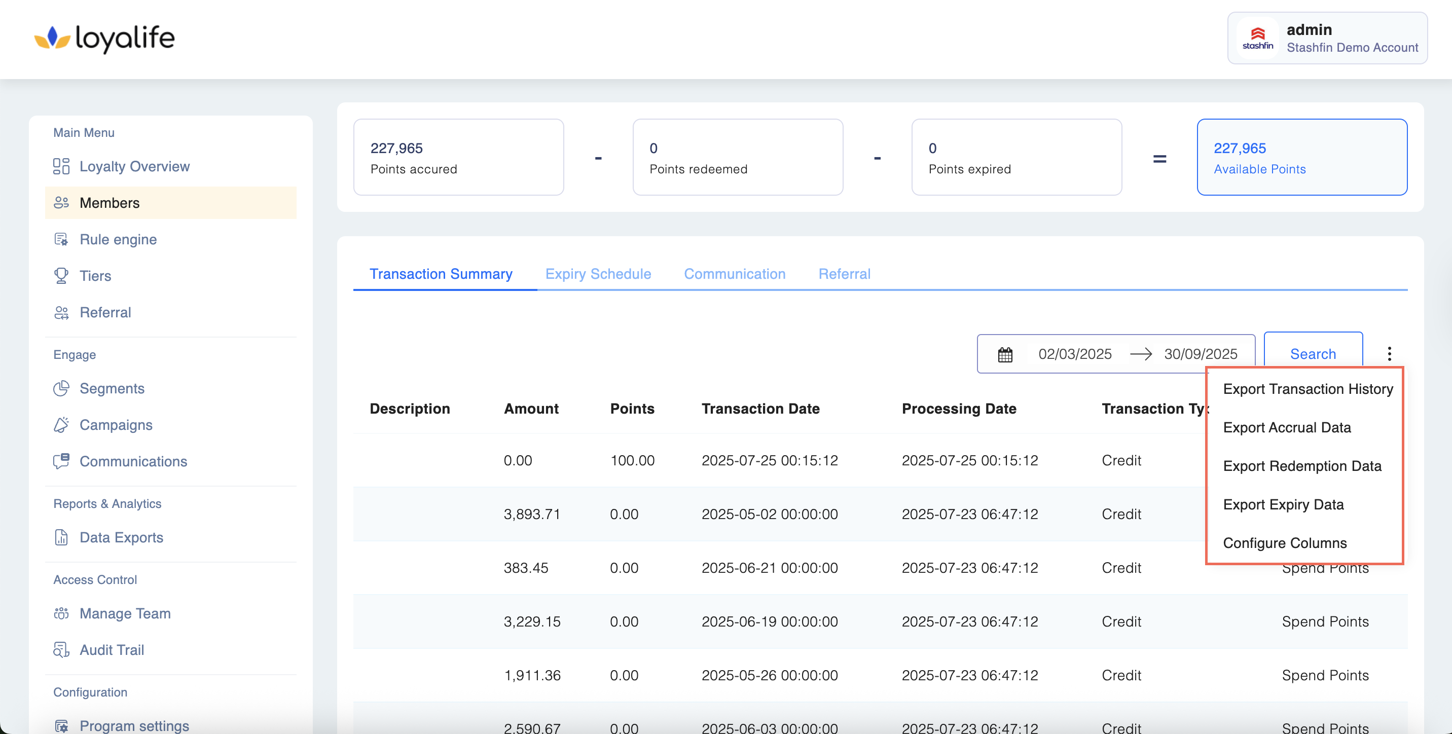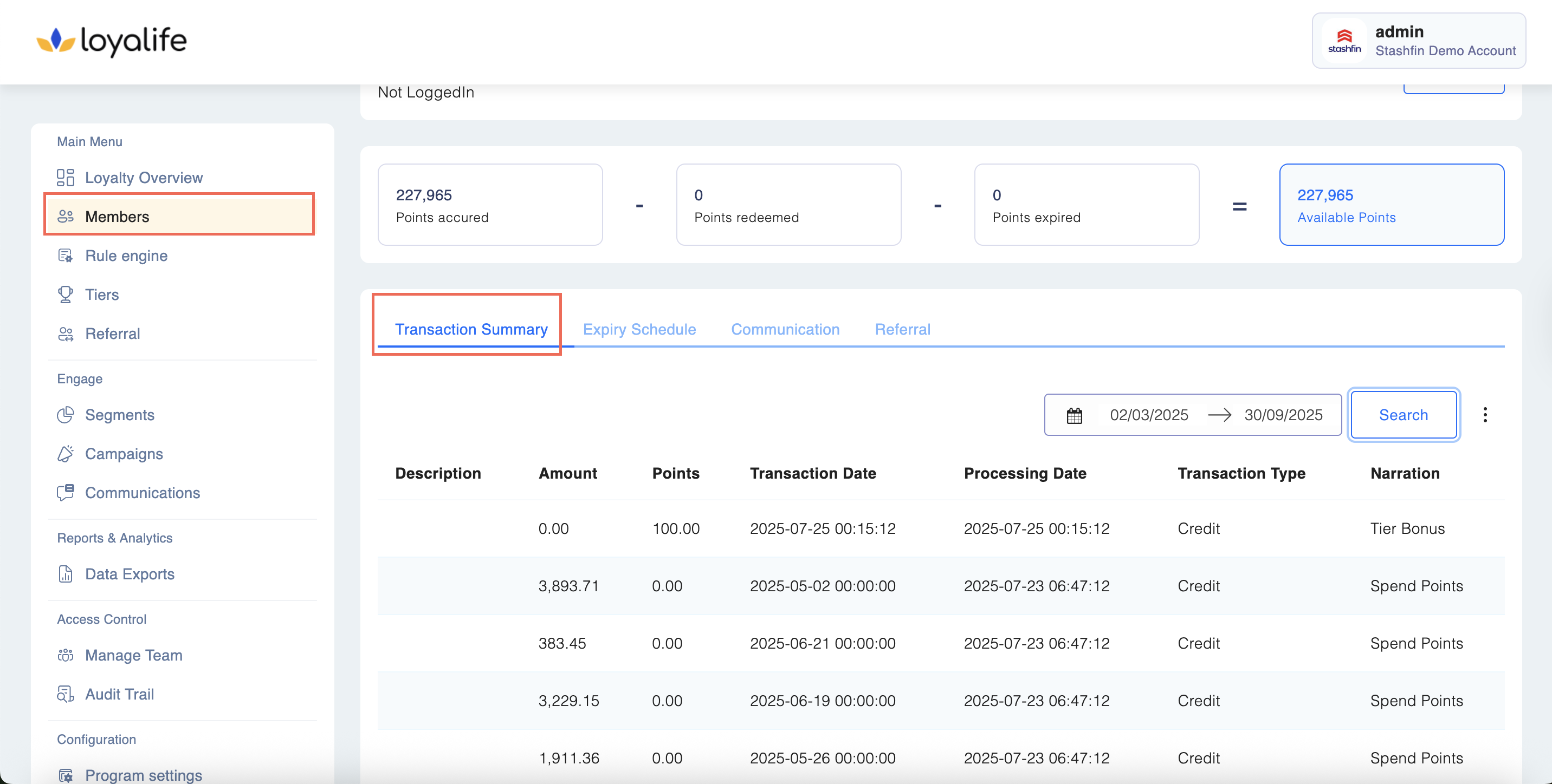 This section displays all member transactions over a specified time frame, including transaction date, points credited/debited, running balance, transaction type, and narration.