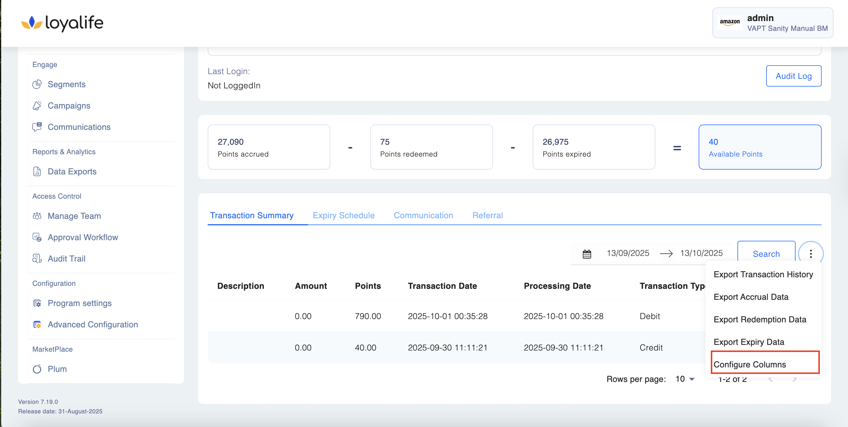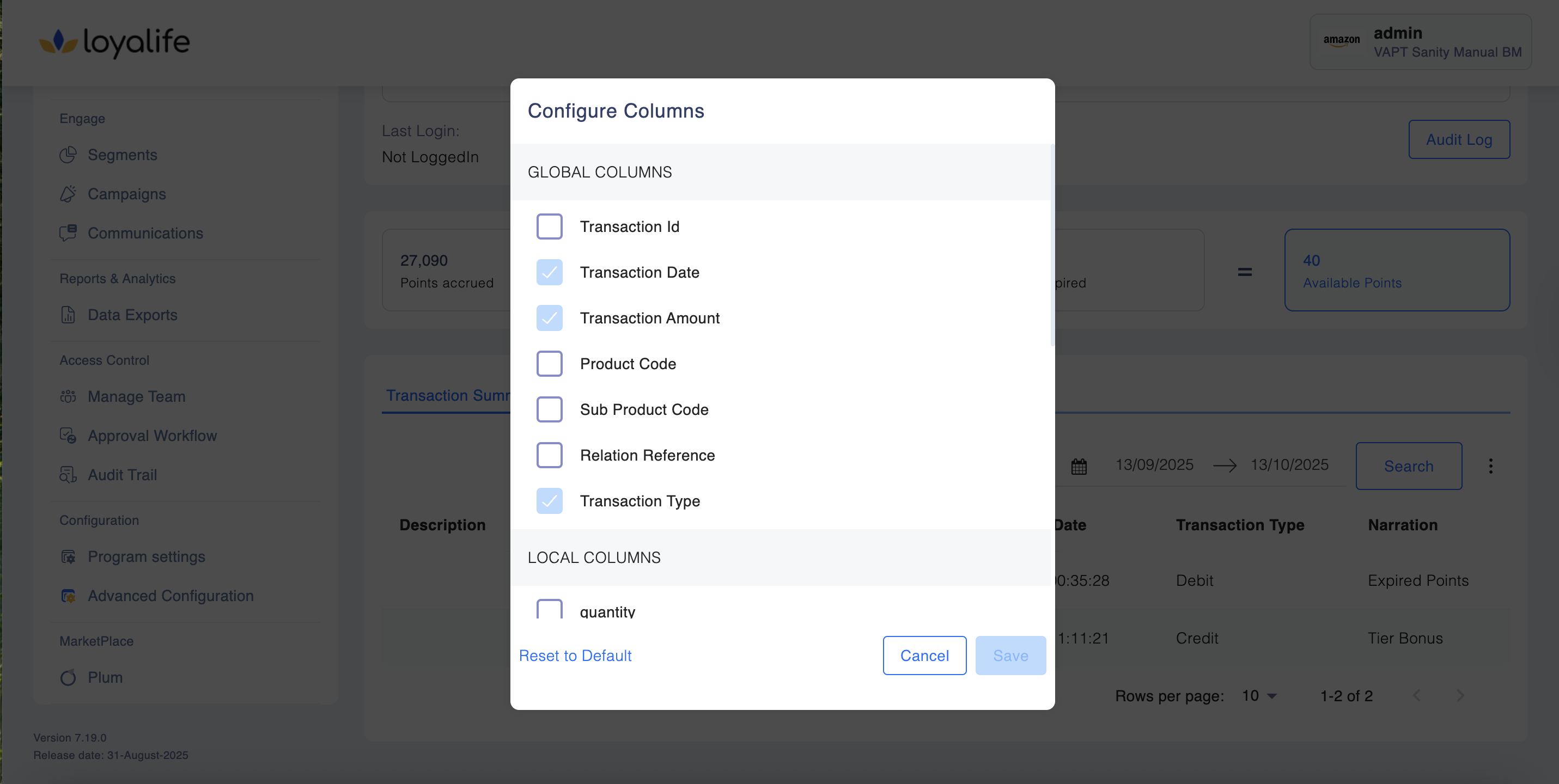 - Transaction Type – Indicates whether the transaction was a debit (points deducted) or a credit (points added). This classification helps in monitoring accruals and redemptions.