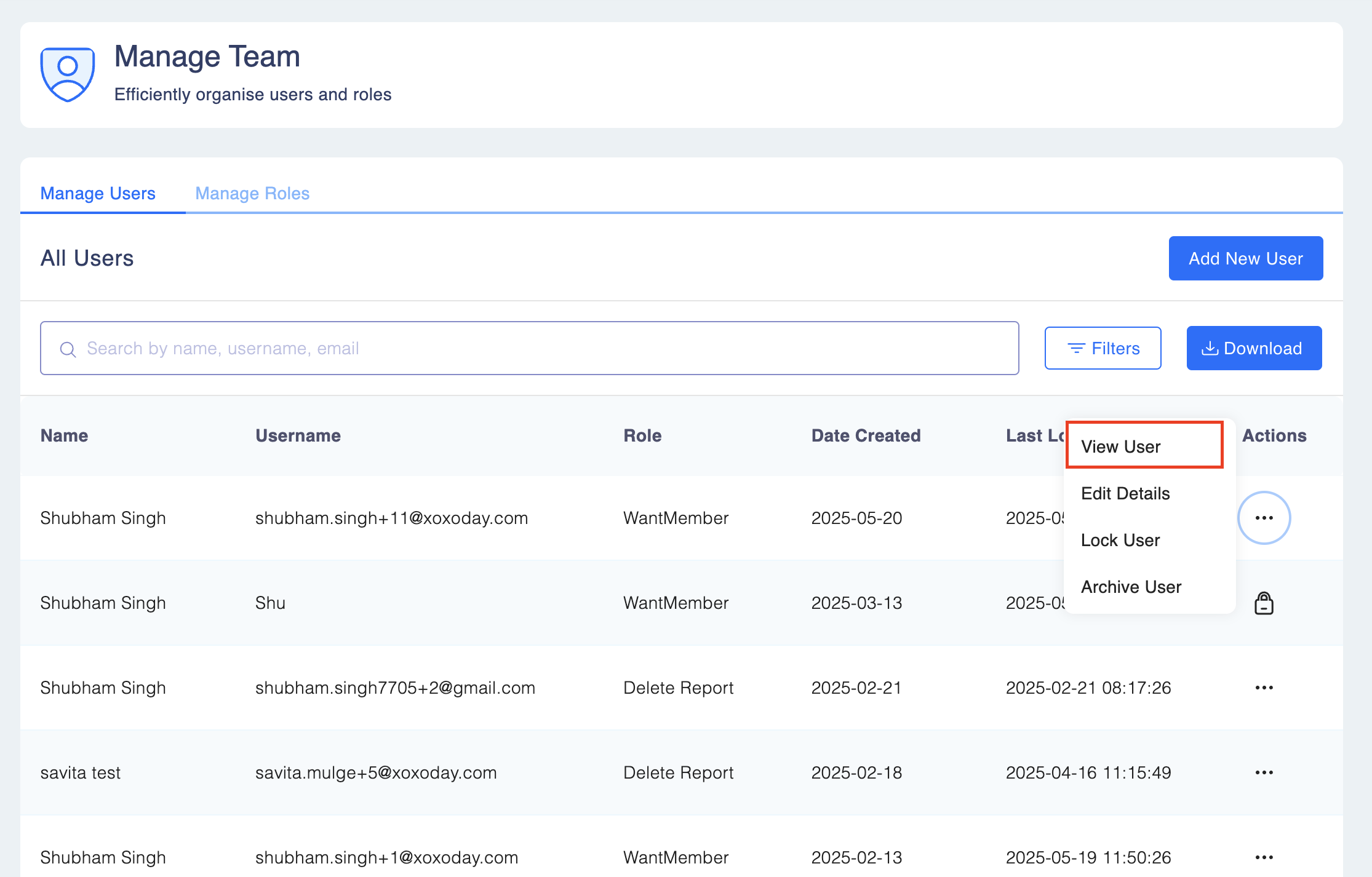 Step 2: Locate the specific user whose roles you want to view. Click on three dots icon next to the user’s name. Select View from the listed options.
