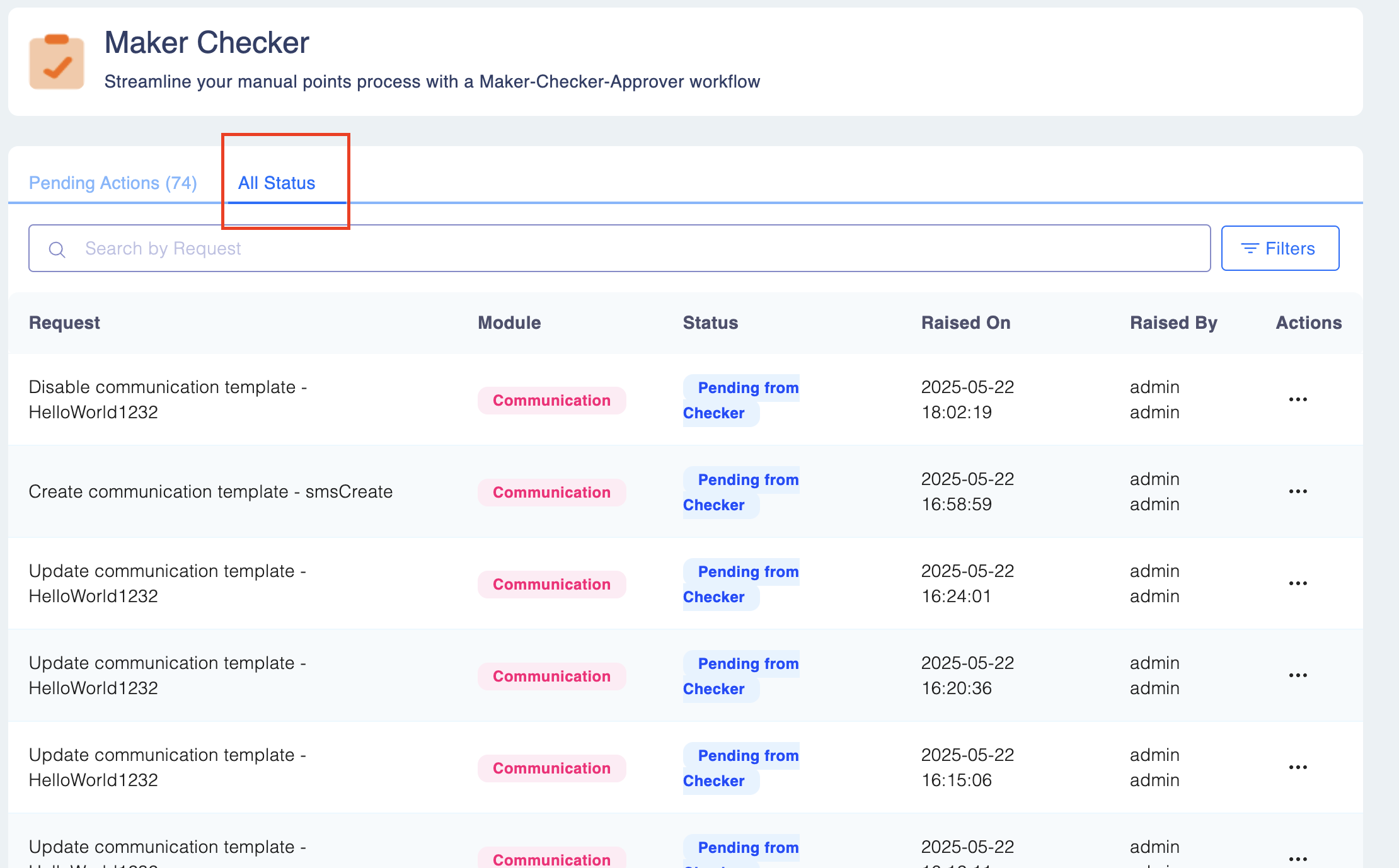 In the ‘All Status’ module, the user can view all the actions that have come under the maker checker workflow. It shows the status of the actions along with other details. The user can choose to approve/ reject the pending transactions from here as well.
