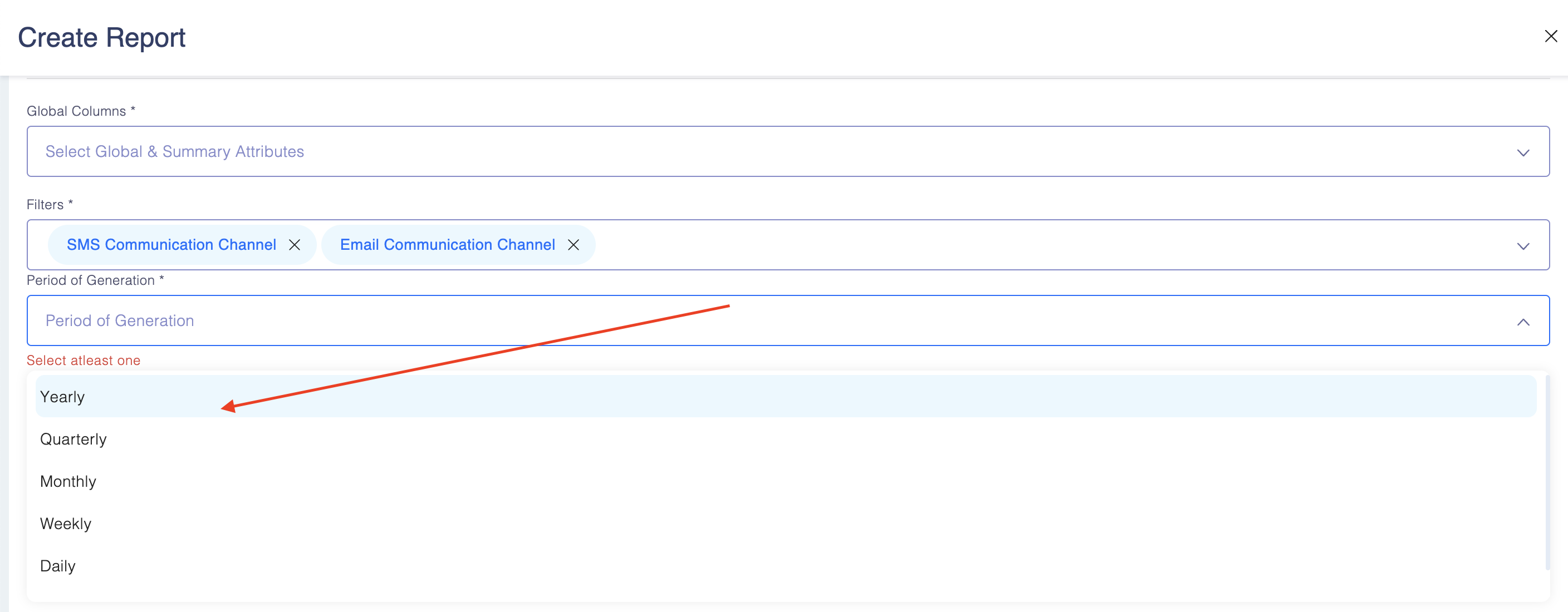 Period of Generation: Select how frequently the report should be generated (e.g., daily, weekly, monthly).