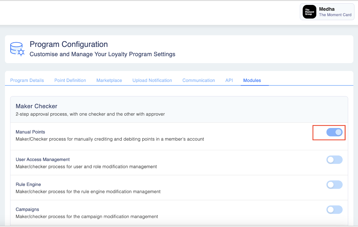 Enable the Module: Toggle the switch or checkbox next to the "Manual Points, Rule Engine, Point Definition, User Access Management through Maker Checker" module to enable it.