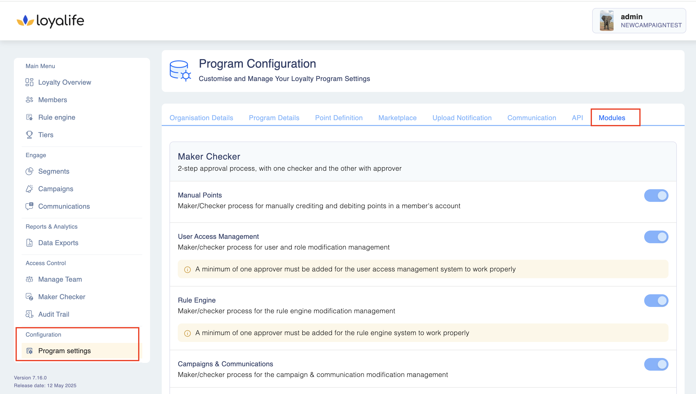 Keep in mindEnabling the Maker-Checker-Approver module is a permanent change and cannot be reverted back to the previous settings. This module enhances security and accuracy in manual points transactions by introducing a multi-level approval process.