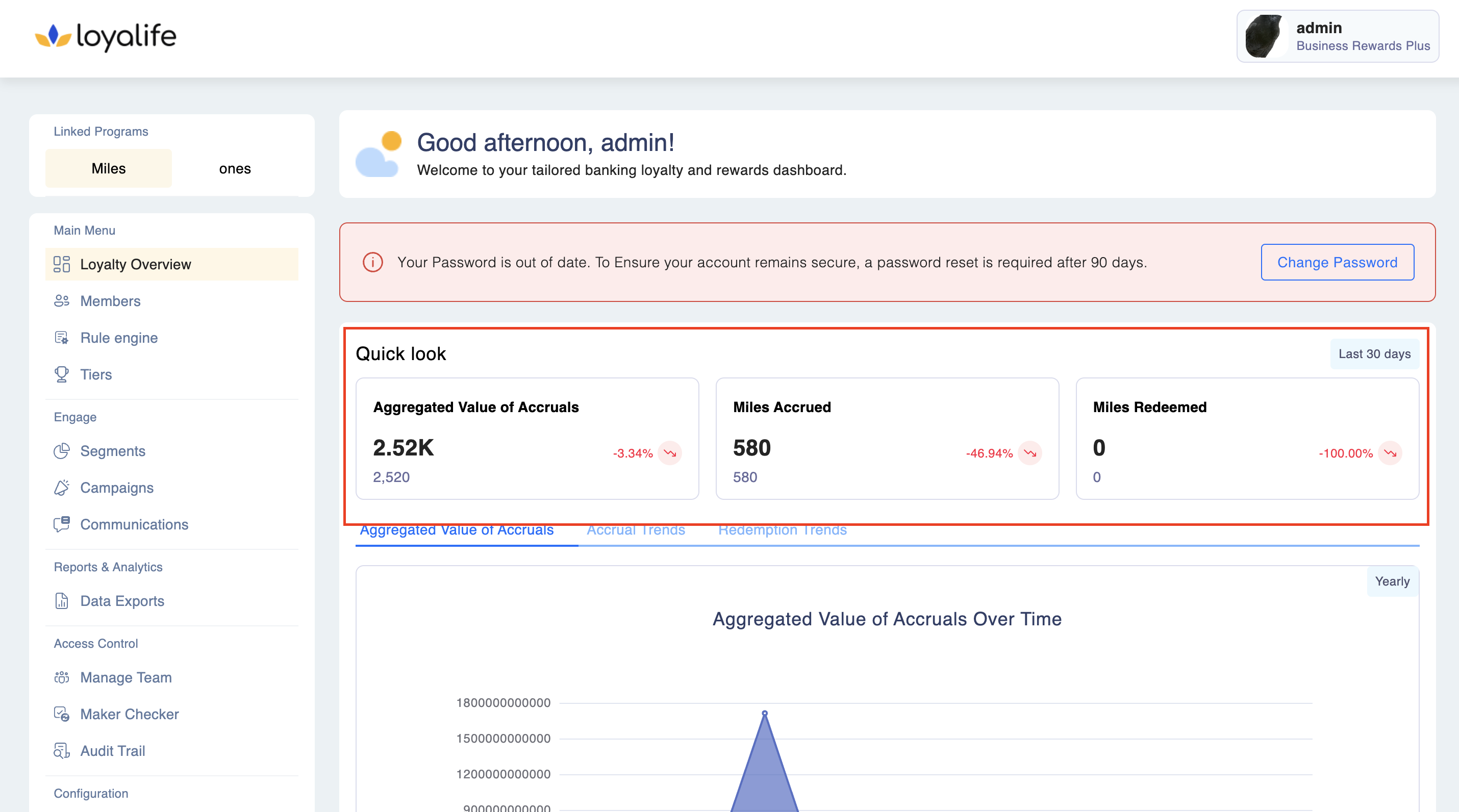 The Loyalife Dashboard provides a comprehensive overview of your loyalty program's key metrics, offering insights into accruals, redemptions, and member engagement trends. This guide will help you navigate the dashboard effectively.