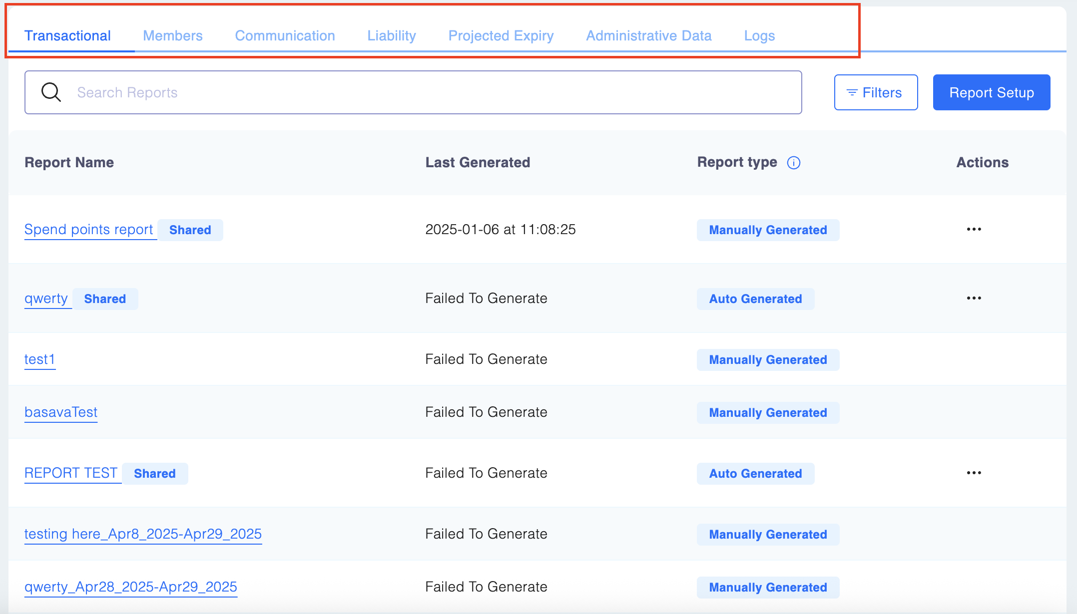 - The report categories (Transaction, Member, Communication, etc.) will be listed as separate tabs for easy access.